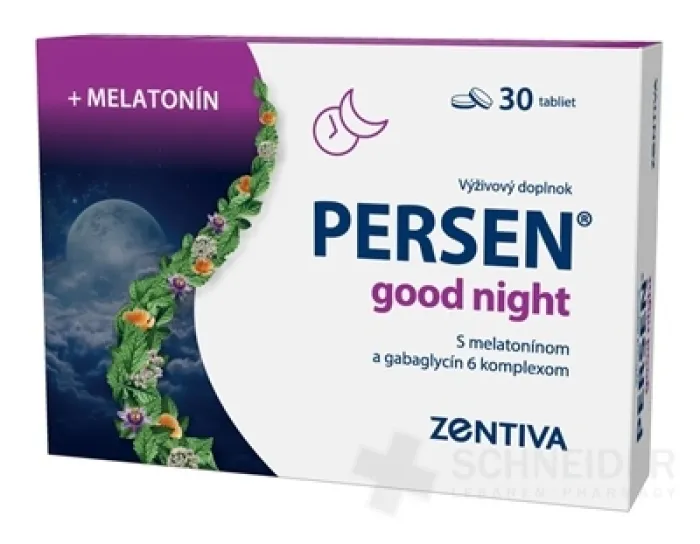 Výživový doplnok s melatonínom, gabaglycin 6 komplexom, suchým extraktom z valeriány, kalifornského maku, mučenky a vitamínmi B3 a B6.