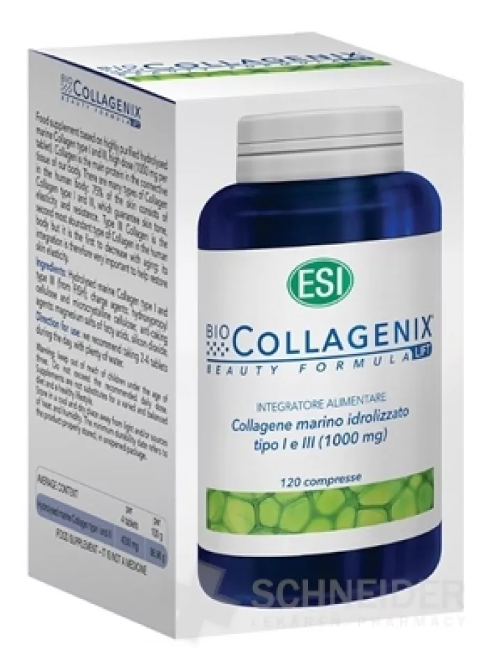 Nahrungsergänzungsmittel mit reinem hydrolysiertem Meereskollagen Typ I und III. Jede Tablette enthält 1 Gramm Kollagen.